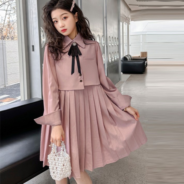 주니어 여아 카라 리본넥 깔끔 단정 결혼식원피스 플리츠 주름 원피스 중학생