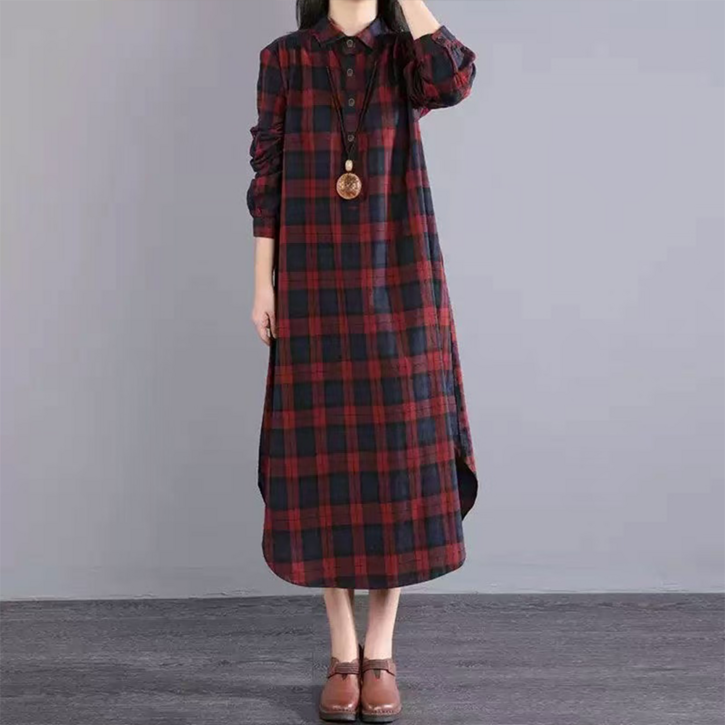 오스틱니 빅사이즈 여성 린넨 체크 셔츠형 롱 언밸 원피스 가을가을 편한 옆트임 카라 버튼 a라인 스커트 배색 우아한 코디 루즈핏 캐쥬얼 프리미엄 원단 패션 얇은 체크 셔츠 원피스