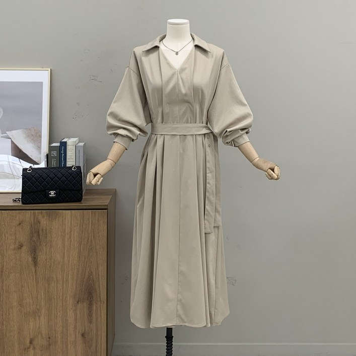 페이퍼먼츠 카라넥 허리 버튼 롱 원피스 08839