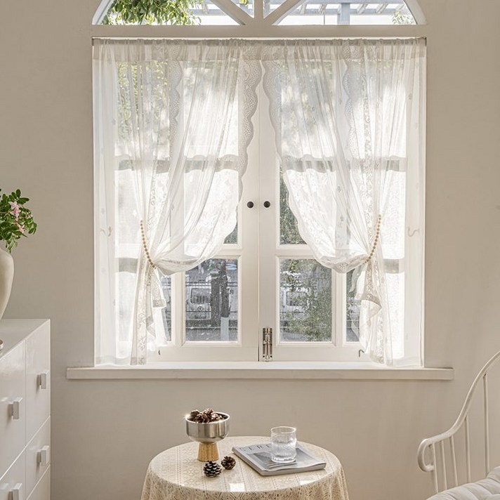 YYT 우아한 화이트 레이스 자수 창문 커튼 예쁜 양문형 가리개 커튼 홈 데코레이션용 장식용 다용도