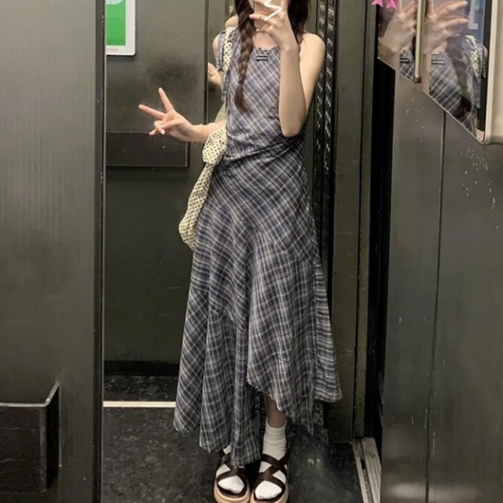 피어니스트 슬림 드레이프 민소매 언발 체크 원피스