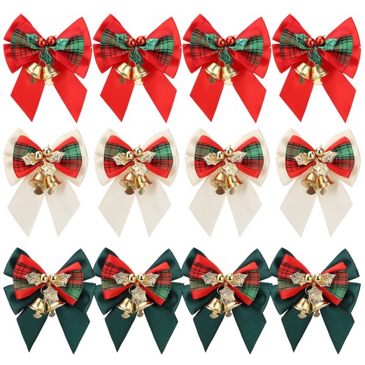크리스마스 벨 리본 세트 빨간색 하얀색 초록색 크리스마스 할리 방울 장식 크리스마스 트리 리스 선물 박스 장식 파티 데코용, 12개
