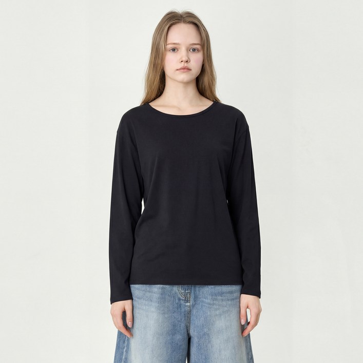 베이직하우스 여성용 찰랑 스판 유넥 오버핏 긴팔 티셔츠