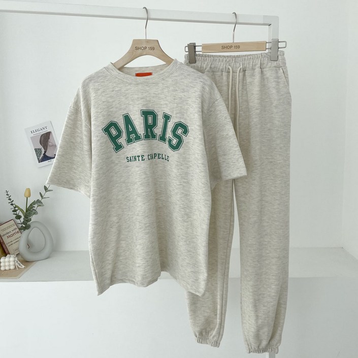 잇츠심플 파리스 레터링 라운드 반팔 조거 트레이닝복 세트