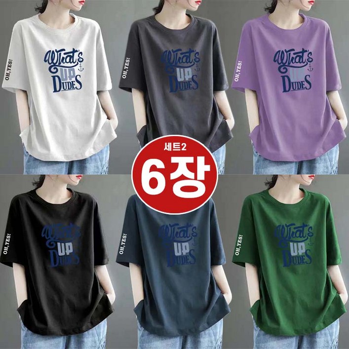 111111 6종세트 여성 여름 빈티지 캐주얼 루즈핏 반팔 티셔츠 데일리 프린팅 라운드넥 편안한 오버핏 반팔티