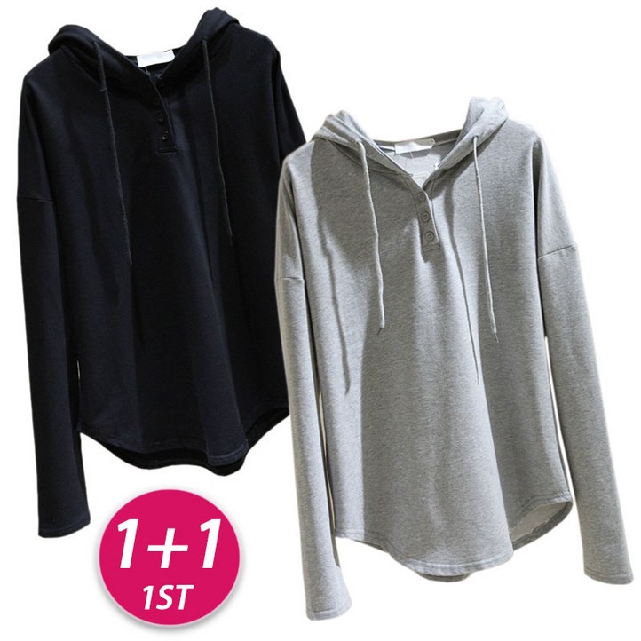 11 여성 봄 가을 베이직 버튼 포인트 긴팔 후드 티 풀오버 무지 맨투맨 루즈핏 후디 캐주얼 데일리 간절기 스트랩 이너 후드 2장 묶음