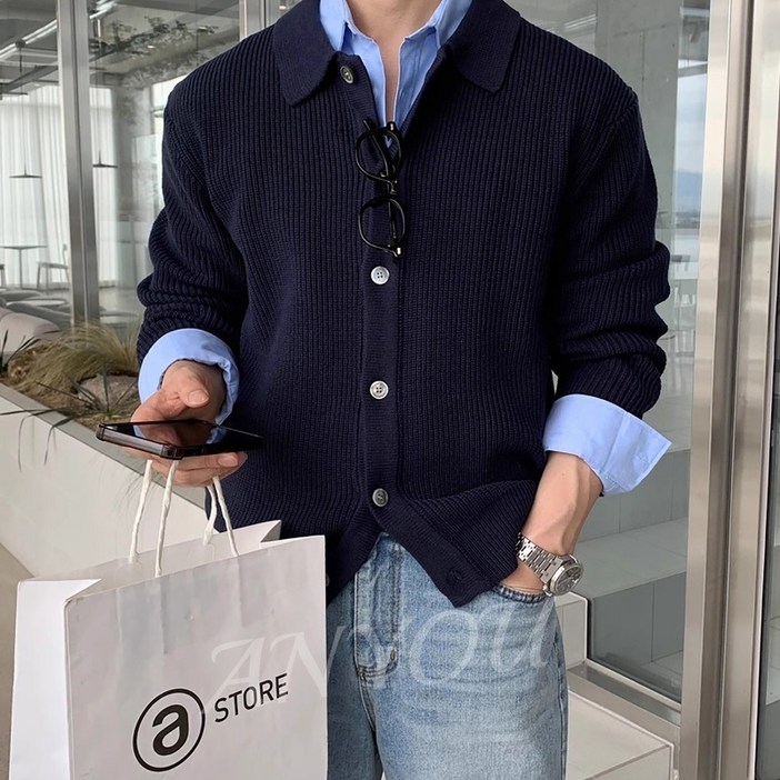 ANYOU 남성용 니트 긴팔 루즈핏 칼라 가디건 패션 코트