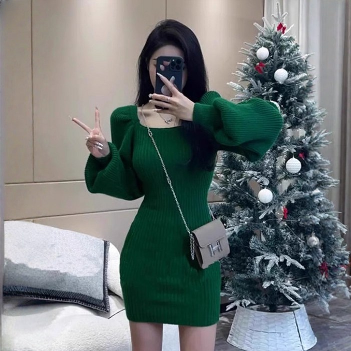 SunburstWonder 여성 가을 겨울 니트 원피스 스퀘어넥 예쁜 크리스마스룩